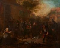 Richard Mennesz. Brakenburgh (1650-1702), dorpsscène bij de herberg, olieverf op doek, l.o. gesigneerd -verf op plekken dun, inschilderingen, gedoubleerd-, 41 × 50 cm