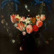 Navolger Daniël Seghers (1590-1661), bloemguirlande met onder andere apothekersrozen, gemarmerde tulpen, twee narcissen, en hyacinth, opgehangen aan twee blauwe strikken, aan de linkerzijde een admiraalvlinder, olieverf op doek, niet gesigneerd, tweede helft 17e eeuw -enkele kleine inschilderingen-, 58,5 × 53,5 cm, herkomst: Gebroeders Douwes, Amsterdam, nr. 8595, Antiekbeurs Delft, 1971, voorheen toegeschreven aan Jan van der Hecke de oude (1620-1684)