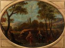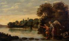 Hollandse School: Tobias en de engel, op de achtergrond een herder met schaapskudde, vrije kopie naar Adam Elsheimer (1578–1610), olieverf op paneel, niet gesigneerd, 17e eeuw, draagt naamplaatje David Colijns, maar niet van zijn hand -inschilderingen, verf ietwat verpoetst-, 39 × 64,5 cm