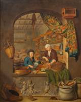 Hollandse School: kopie van de 'Kruidenierswinkel' van Willem van Mieris (1662-1747) uit het Mauritshuis, olieverf op doek, niet gesigneerd, 18e/19e eeuw, 57 × 45 cm
