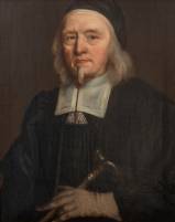 Schilderij: portret van een geestelijke met wandelstok, olieverf op doek, 17e eeuw, niet gesigneerd -gedoubleerd-, 67 × 51,5 cm