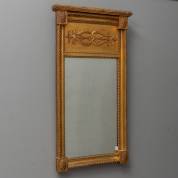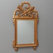 Spiegel in vergulde lijst, bekroond door snijwerk met fakkel, pijlenkoker en laurierkransen, 20e eeuw, 80 × 45 cm