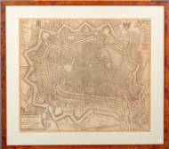 Gravure, kaart van Middelburg: 'Afbeelding van de stad Middelburg in Zeeland', door Cornelis Goliat, uitgegeven door Christiaan Vermey te Leiden, 1717 -licht gebruind, vouwen-, 46 × 54 cm