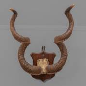 Gewei van een koedoe, op houten wandplaat, 79 × 53 × 58 cm