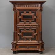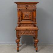Eiken luierkabinetje, rondom voorzien van gezwarte accenten en snijwerk, zoals vogels, leeuwenkoppen en acanthusranken, Hollands, renaissance, 161 × 76 × 43 cm