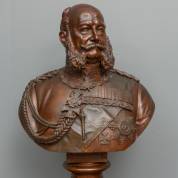 Gebronsde zamak buste van keizer Wilhelm I van Duitsland, gesigneerd A. Michele, 1887, hoogte 64 cm, op zuilvormige eiken piëdestal, hoogte 115,5 cm
