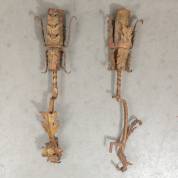 Paar smeedijzeren wandkandelaars met bladerdecor -twee stukjes van blad afgebroken, voorzien van oog voor wandmontage-, 65 cm