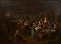Omgeving van Richard Brakenburgh (1650-1702), vrolijk gezelschap in een herberg, olieverf op doek, niet gesigneerd -verf plaatselijk wat dun, gedoubleerd-, 68 × 92 cm, herkomst: Sotheby's Amsterdam, veiling 494, lot 203, november 1988