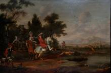 Hollandse School: jachttafereel met dame en heer te paard, olieverf op paneel, niet gesigneerd, 17e eeuw -paneel gelijmd en diverse inschilderingen-, 75 × 108 cm, herkomst: Huize Heesterlust, Schuddebeurs