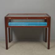 Mahonie tafelvitrine met gelaagd glas, de binnenzijde bekleed met groen-blauw velours en voorzien van ledstrips op batterijen, 20e eeuw -gebruikssporen, verlichting niet getest-, 91 × 120 × 60 cm