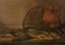 Toegeschreven aan Pieter de Putter (ca. 1600-1659), visstilleven met snoek, blankvoorn, brasem, schepnet en vaatwerk, olieverf op paneel, niet gesigneerd -paneel in twee losse delen, beschadiging rechts midden, beetje verfverlies en enkele krasjes-, 38 × 55 cm, op de lijst een label van jonkheer Barthold Willem Floris van Riemsdijk (1850-1942), directeur van het Rijksmuseum tussen 1897 en 1921 met toeschrijving aan De Putter