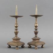 Paar messing penkandelaars met driehoekig basement en bolpootjes, Zuid-Europa, 17e eeuw, 30 cm