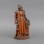 Palmhouten beeld: vrouwelijke heilige met boeken en rol papier, leunend op een gotisch kastje, onduidelijk gemonogrammeerd en gedateerd 1503, vermoedelijk 20e eeuw, hoogte 34 cm