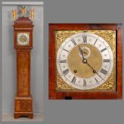 Engels staand horloge, in notenhouten kast, de vierkante messing wijzerplaat met verzilverde cijferring en seconde aanduiding, gesigneerd Anthony Guiguer, London, circa 1700, slagwerk op enkele bel, inclusief slinger, twee gewichten en opwindsleutel, hoogte 275,5 cm inclusief poppen