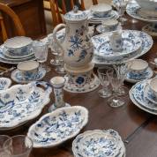 Porseleinen serviesgedeelte met blauw-wit Zwiebelmuster, voornamelijk uitvoering Meissen, bestaande uit: zes dinerborden Ø 25 cm, zeven diepe borden Ø 24, zes ontbijtborden Ø 20 cm, zes soepkommen-en-schotels, zes theekop-en-schotels, tazza, bedekte terrine, diverse dienschalen, botervloot, fruitschaal met onderschotel, twee diverse sauskommen, asbak, zes eierdoppen, koffiekan, melkkan, komfoor met brander, kandelaar, etc.