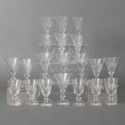 Drie karaffen met geslepen monogrammen: eenmaal gekroonde B tweemaal gekroonde HB -aanslag binnenin-, daarbij: negen geslepen wijnglazen, alle 19e eeuw