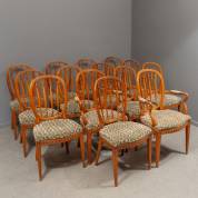 Veertien iepen stoelen, waarvan twee armstoelen, met olijfgroene velours bekleding en spijlen in de ronde rugleuning, in de stijl van Albert Eeltjes (1751-1836), circa 1800 -één spijl gelijmd, enkele met wat speling in verbindingen-