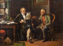 Benjamin Vautier (1829-1898), op bezoek bij de notaris, olieverf op doek, r.o. gesigneerd, -meerdere inschilderingen, gedoubleerd, craquelé, beetje verfverlies-, 63 × 79,5 cm