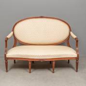 Mahoniehouten tweezits bank, de beige bekleding met bloemdecor, Louis Seize-stijl, 19e eeuw, 108 × 147 × 57 cm