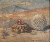 Pieter de Zwart (1880-1967), twee cactussen in een woestijnlandschap, te weten een Ariocarpus fissuratus en een Mammilaria senilis, aldus annotaties op de achterkant, olieverf op triplex, r.o. gesigneerd en gedateerd '27, 19 × 22,5 cm