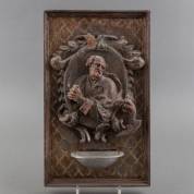 Tinnen wijwaterbakje op gestoken houten achterplaat met Petrus in medaillon, geflankeerd door haan, 18e eeuw -defecten en enkele oude houtwormgaatjes-, 42,5 × 25,5 cm