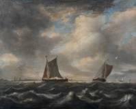 Hollandse School: schepen op woelige zee voor de Hollandse kust, olieverf op doek, niet gesigneerd, 17e/18e eeuw, verso op spieraam toegeschreven aan Porcellis, maar niet van zijn hand -verdoekt, verpoetst, twee beschadigingen aan de rechterzijde-, 45 × 57 cm