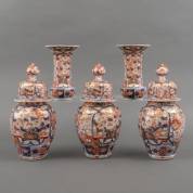 Vijfdelig Japans porseleinen Imari kaststel, rijk gedecoreerd met bloemen, alle gesigneerd 'Yamanaka zô', tweede helft 19e eeuw -één dekselvaas gerestaureerd bij hals-, 35 cm hoog