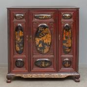 Gelakte naaldhouten kast met op de drie deuren lakpanelen, in het interieur drie lades, China, modern -laklaag op plekken gebarsten-, 129 × 124 × 60 cm