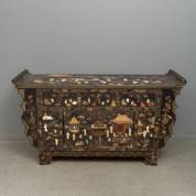 Chinese wandkast met figuratief decor in lakwerk, been en steen: figuren bij landhuis -vele defecten aan inlegwerk, sommige delen los bijgevoegd; rechter deurtje los; slijtages rondom-, 90 × 164 × 47 cm