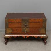 Iepen kist met klep en lade, het messing beslag met geëtst bloem- en vogeldecor, China, tweede helft 20e eeuw, 50 × 89 × 49 cm