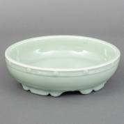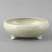 Rond Chinees celadon wierookvat op drie pootjes, de rand met kleine bloempjes in reliëf en de buitenzijde met subtiel ingekerfd lijnendecor, Ming -barst, twee chipjes van binnenrand-, 10 × Ø 27,5 cm