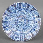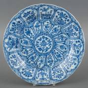 Chinees porseleinen schotel met blauw-wit bloemdecor in vakverdeling, gemerkt, Kangxi -enkele chipjes van rand, één randchip onvakkundig ingekleurd-, Ø 38 cm