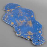 Zeldzame Chinees porseleinen poudre bleu wandplaquette met gecontourneerde rand en verguld decor van herten en een opening voor een wandapplique, Kangxi -randchip, slijtage aan decor-, 56 × 31,5 cm, tentoongesteld geweest in de International Exhibition of Chinese Art, 1935-1936, catalogusnummer 1761