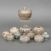 Elf diverse keramische (deksel)potjes met grijs/blauwe decors, Sawankhalok en Ming -enkele defecten-, hoogste 10 cm