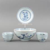 Chinees porseleinen kom met blauw-wit decor, -resten van Imari schildering-, Chinees porseleinen schotel met blauw-wit decor, en zes Chinees porseleinen kommen met blauw-wit landschapsdecor -resten van Imari schildering, randschilfers, één kom gelijmd en missende chip-, alle midden 18e eeuw, grote kom 7 × Ø 15 cm, herkomst: Christie's, Nanking Cargo