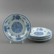 Zeven Chinese porseleinen borden met blauw-wit bloemdecor, Qianlong -randchips, haarlijnen, randschilfers-, Ø 23 cm