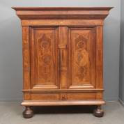 Notengefineerde pastoorskast met lade, het geheel met ingelegde biezen, staand op bolpoten, eind 17e/18e eeuw -herstellingen en kleine defecten-, 200 × 178 × 80 cm