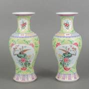 Paar balustervormige Chinees porseleinen famille rose vazen met ronde medaillons en gespiegelde decors van dieren, op lichtgroen fond met bloemen, 19e/20e eeuw, 34 cm hoog