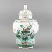 Chinees porseleinen famille verte dekselvaas met decor van een lotusvijver en bloesemboom, Kangxi gemerkt, Guangxu -standring is niet vlak-, 37,5 cm hoog