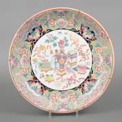 Chinees porseleinen famille rose schotel met centraal decor van kostbaarheden, de rand met vol decor van bloemen en vleermuizen met perziken, gemerkt in bovenglazuur blauw met artemisiablad, Guangxu -haarlijn van circa 5 cm-, Ø 41 cm