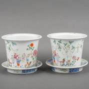 Paar Chinees porseleinen famille rose cache-pots op onderschotels, met decor van kinderen, hanen en goudvissen, Guangxu gemerkt en periode -kalkaanslag op onderschotels-, potten 17,5 × 22 cm, onderschotels Ø 23 cm