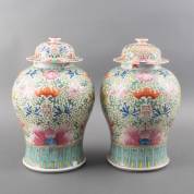 Paar Chinees porseleinen dekselpotten met famille rose floraal decor, Daoguang, 19e eeuw -een deksel met chip-, 43 × Ø 26 cm