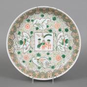 Chinees porseleinen famille verte schotel met centraal decor van kostbaarheden, daaromheen bloem- en bladmotieven, 19e eeuw -twee randschilfers-, Ø 36,5 cm
