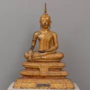 Verguld bronzen Boeddha, de handen in bhumisparsha mudra, zittend op gelaagde troon, Thailand, 19e eeuw -slijtages, ushnisha zit los-, 78,5 × 53 × 27,5 cm