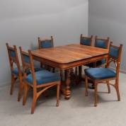 Zes eiken stoelen met blauwe stoffering, circa 1900, en een notenhouten tafel, Henri Deux-stijl, circa 1900 -gebruikssporen-, tafel 75 × 128 × 115 cm