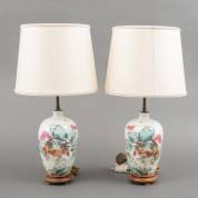 Paar lampvoeten gemaakt van Chinees porseleinen vazen met polychroom decor van hanen bij rotspartij, 20e eeuw, hoogte zonder kappen 32 cm