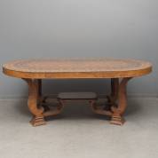 Tafel gefineerd met diverse houtsoorten in geometrische patronen en met rondlopend klimopmotief, tussen de vier poten een etagère, het blad voorzien van glazen plaat, tweede kwart 20e eeuw -lichte gebruikssporen aan onderstel-, 77 × 211 × 117 cm