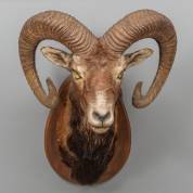 Geprepareerde moeflonkop op houten achterplaat, circa 52 × 40 × 41 cm