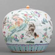 Bolvormige Chinees porseleinen famille rose dekselpot met hanendecor, de onderzijde turquoisegeglazuurd, 19e eeuw -lichte randchips van de hals-, hoogte 21 cm