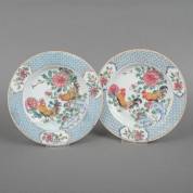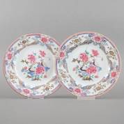 Paar Chinees porseleinen famille rose borden, decor: fazanten tussen bloemen, Yongzheng/Qianlong -één bord met minieme randschilfers en klein stukje craquelé in de rand-, Ø 22,7 cm